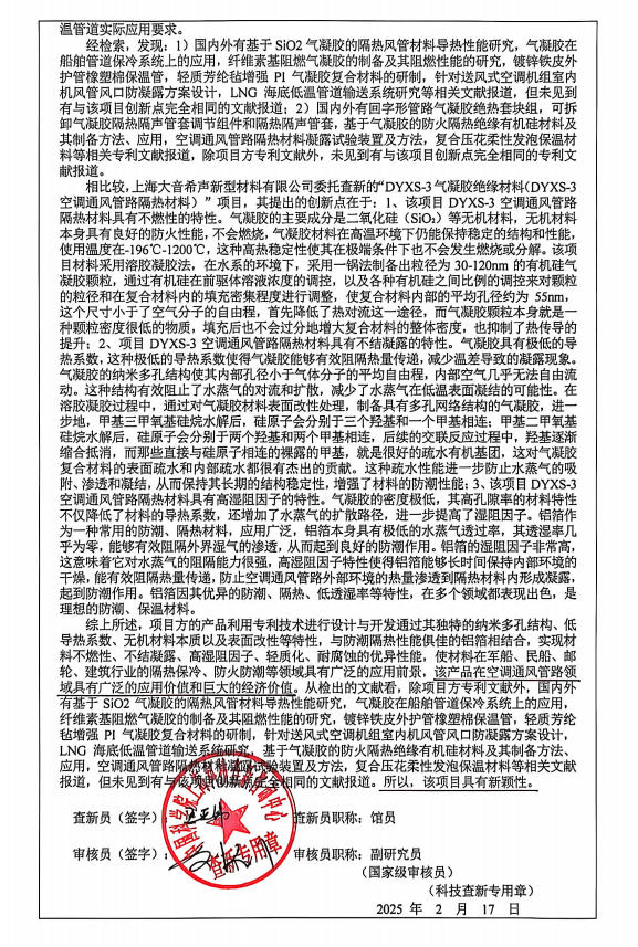 2025年2月17日,我司产品DYXS-3气凝胶绝缘材料通过科技查新确认技术新颖性,三大核心创新特性引发行业关注。该材料具备-196℃至1200℃超宽域不燃性能,结合疏水改性纳米多孔结构实现零结凝露,铝箔复合工艺使湿阻因子突破行业新高。作为空调通风管路专用隔热材料,其技术指标已通过权威检测,未来有望广泛应用于建筑节能、冷链物流等多领域,推动隔热材料行业技术升级。